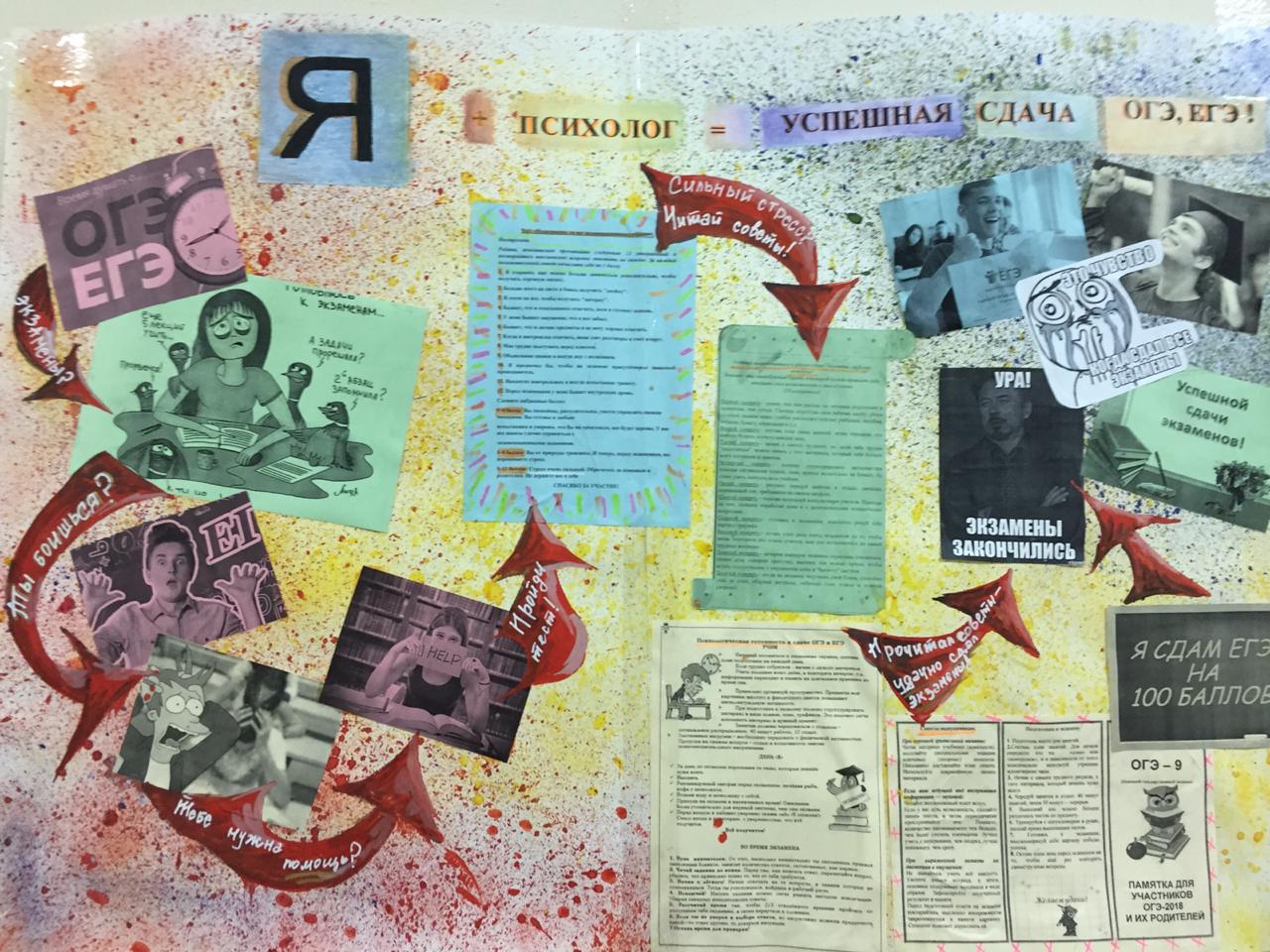 Школьный психолог Екатерина Сергеевна Шахова вместе с будущими выпускниками, которым предстоит сдевать экзамены, сделала плакат с памятками, рекомедациями и тестом. С этими материалами вы можете ознакомиться в этой заметке ниже.